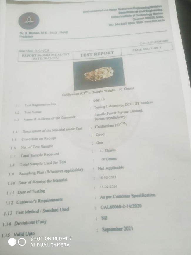 इस टेस्ट को IIT Madras में कराया गया है। इस पदार्थ को पुडुचेरी की न्यूक्लियर पावर कंपनी का बताया गया है।