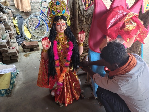मां सरस्वती की मूर्ति बनाते मूर्तिकार।