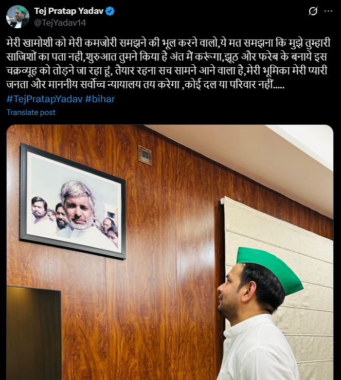 तेज प्रताप ने लिखा है, मेरी खामोशी को मेरी कमजोरी समझने की भूल करने वालों, ये मत समझना कि मुझे तुम्हारी साजिशों का पता नहीं, शुरुआत तुमने की है... अंत मैं करूंगा। झूठ और फरेब के बनाए इस चक्रव्यूह को तोड़ने जा रहा हूं, तैयार रहना सच सामने आने वाला है, मेरी भूमिका मेरी प्यारी जनता और माननीय सर्वोच्च न्यायालय तय करेगा, कोई दल या परिवार नहीं।