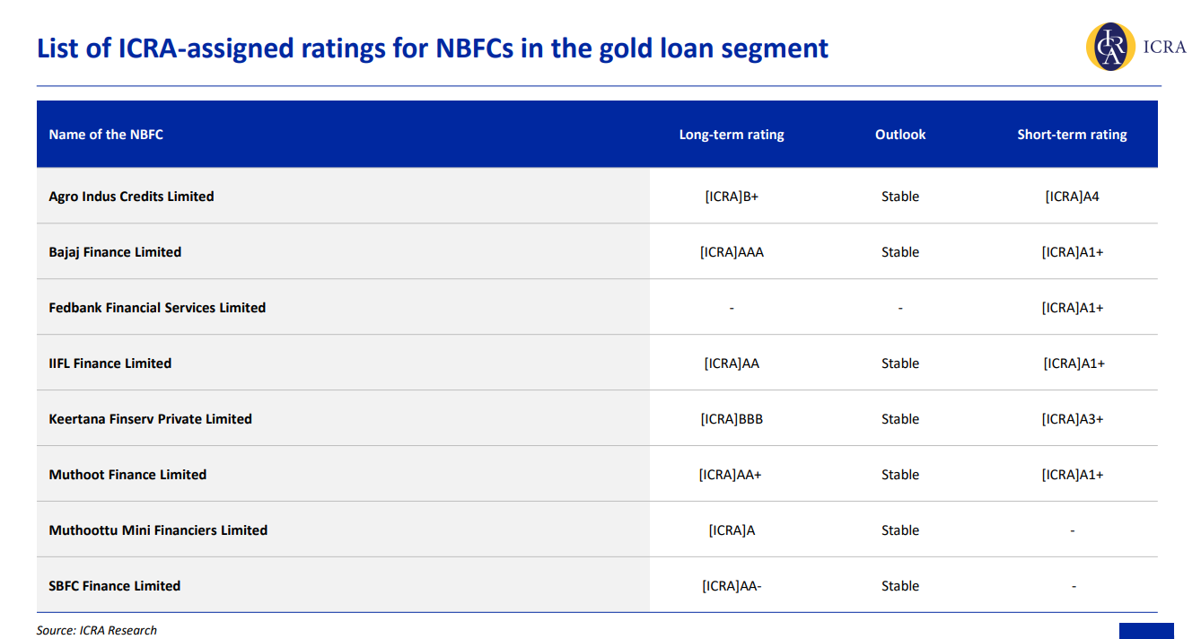 गोल्ड लोन देने वाली NBFC के लिए ICRA द्वारा दी गई रेटिंग । सोर्स- ICRA रिपोर्ट, अप्रैल 2025