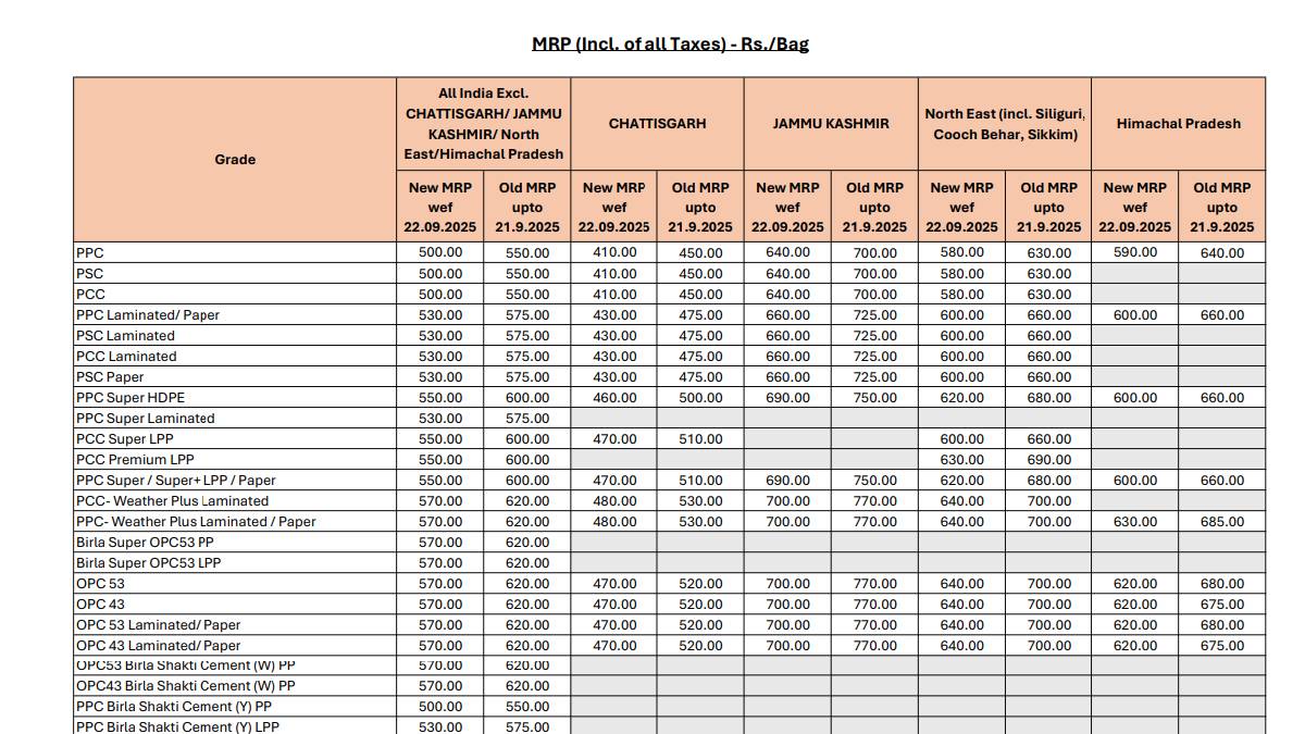 सीमेंट पर जीएसटी 28% से घटाकर 18% कर दिया गया, जिससे आवास और बुनियादी ढांचे की लागत कम हो गई। जीएसटी रेट कट के बाद इनमें से कुछ ही कंपनियों ने अपने सीमेंट के दाम घटाए हैं। देश की सबसे बड़ी सीमेंट कंपनी अल्ट्राटेक ने 22 सितंबर से पहले ही रेट कट का ऐलान किया था। नए रेट 22 सितंबर से लागू भी हो गए हैं।