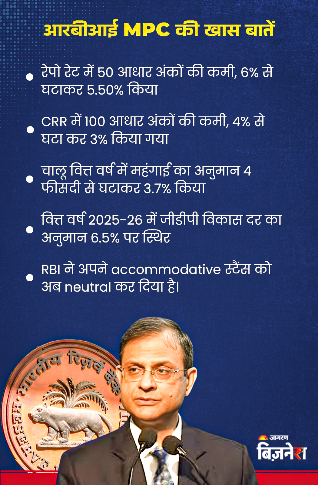 RBI Repo Rate Updates भारतीय रिजर्व बैंक की मौद्रिक नीति समिति की द्विमासिक समीक्षा बैठक शुक्रवार को समाप्त हो गई। रिजर्व बैंक के गवर्नर संजय मल्होत्रा ने फैसलों को ऐलान किया। इसमें सबसे महत्वपूर्ण फैसला रेपो रेट का था जिसमें आरबीआई ने 50 आधार अंकों की कटौती कर दी है यह बाजार की उम्मीद से कहीं अधिक है।