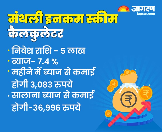 पोस्ट ऑफिस स्कीम में अगर आपने 5 लाख रुपये का निवेश किया है तो आपको 7.4 फीसदी ब्याज के हिसाब से हर महीने आपको 3,083 रुपये का इंटरेस्ट इनकम होगा। इस तरह कैलकुलेट करें तो आपको एक साल में ब्याज से 36,996 रुपये का इनकम होगा।