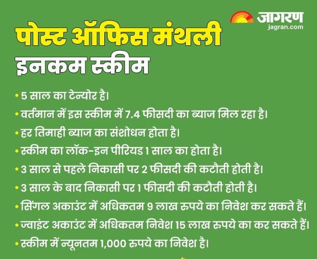 बिजनेस डेस्क, नई दिल्ली। Post Office Monthly Income Scheme (POMIS): अगर आप गारंटी रिटर्न के लिए इन्वेस्टमेंट स्कीम के ऑप्शन ढूंढ रहे हैं तो आप पोस्ट ऑफिस की स्कीम में भी निवेश कर सकते हैं। इस स्कीम में आप बिना जोखिम के ज्यादा रिटर्न का लाभ उठा सकते हैं।