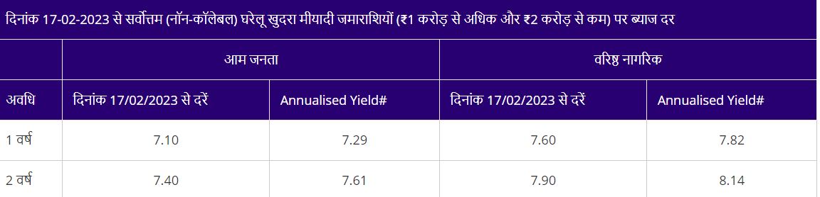 अगर इस एफडी स्कीम में 2 करोड़ रुपये से 5 करोड़ रुपये का बल्क डिपॉजिट किया जाता है तो वरिष्ठ नागरिकों को 1 साल में 7.77 फीसदी और 2 साल के लिए 7.61 फीसदी का ब्याज मिल रहा है।