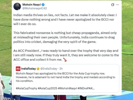 पीसीबी चीफ और एसीसी के अध्यक्ष मोहसिन नकवी ने दावा किया कि उन्होंने कभी भी बीसीसीआई से माफी नहीं मांगी और न ही कभी मांगेगे। न्यूज एजेंसी आईएनएस के अनुसार, नकवी ने सोशल मीडिया प्लेटफॉर्म एक्स पर लिखा कि भारतीय मीडिया झूठ पर फलता-फूलता है, तथ्यों पर नहीं। मैं यह बिल्कुल स्पष्ट कर दूं कि मैंने कुछ भी गलत नहीं किया है और मैंने बीसीसीआई से कभी माफी नहीं मांगी है और न ही कभी मांगूंगा।
