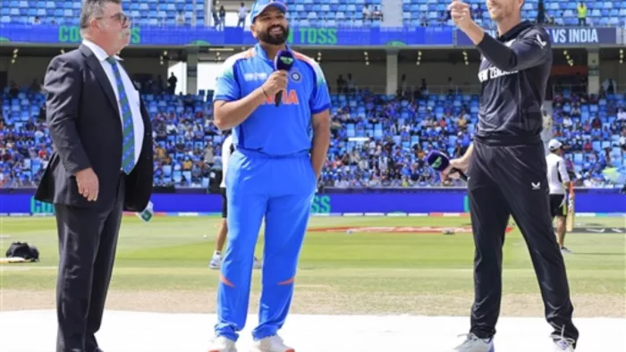 इस मैच में न्यूजीलैंड के कप्तान मिचेल सैंटनर ने टॉस जीता और पहले गेंदबाजी करने का फैसला किया। इस टूर्नामेंट में पहली बार भारत पहले बल्लेबाजी कर रहा है। हालांकि, उसका टॉस हारने का सिलसिला बदस्तूर जारी है।