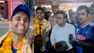 भारतीय कप्तान सूर्यकुमार यादव (Suryakumar Yadav), हेड कोच गौतम गंभीर (Gautam Gambhir) और आईसीसी (ICC) चेयरमैन जय शाह (Jay Shah) वर्ल्ड कप ट्रॉफी लेकर अहमदाबाद के प्रसिद्ध 'हनुमान मंदिर' पहुंचे और बजरंगबली का आशीर्वाद लिया।