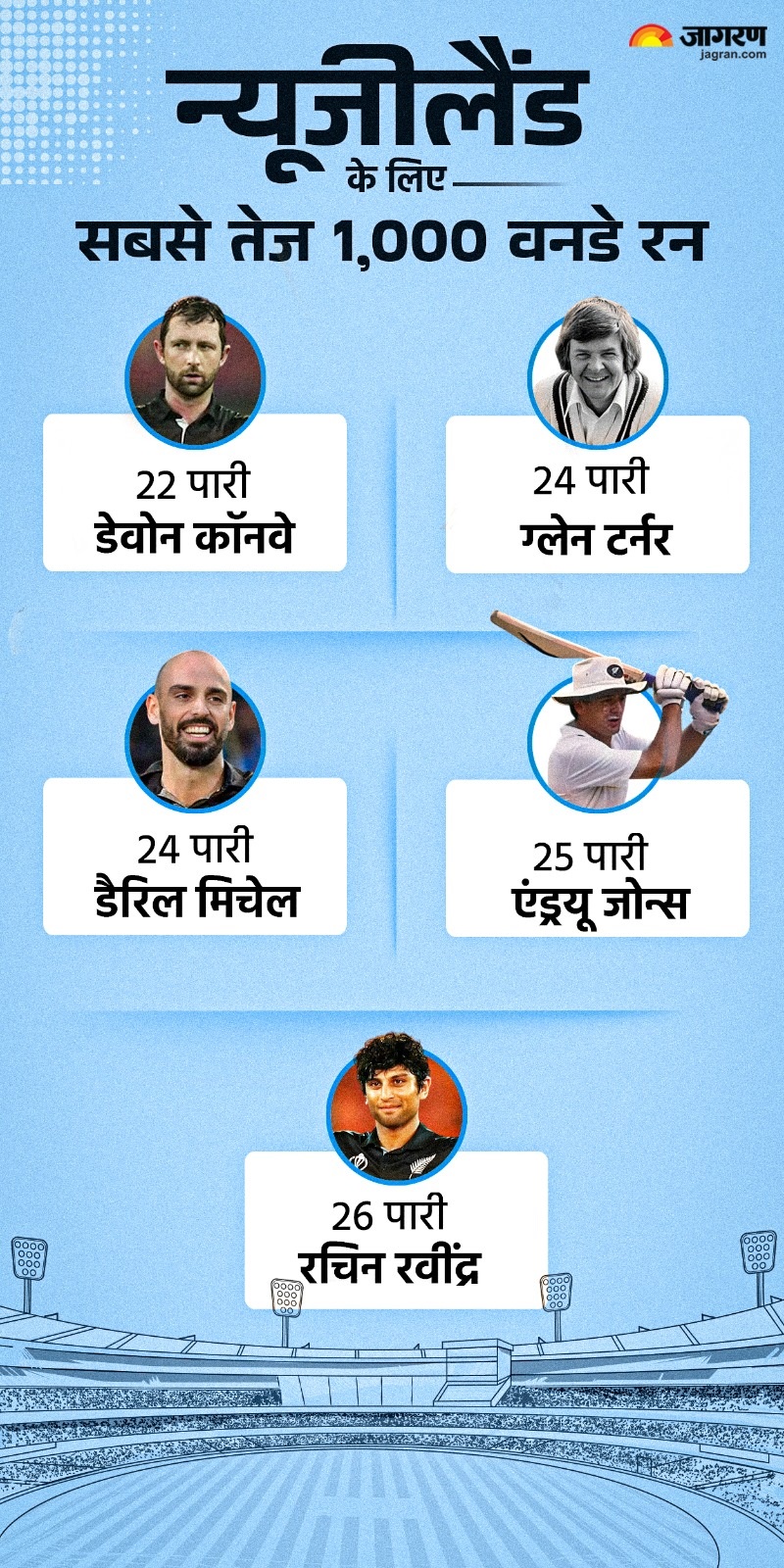- इसके साथ रचिन रवींद्र ने अपने वनडे करियर के 1000 रन भी पूरे किए। वह न्यूजीलैंड की तरफ से वनडे प्रारूप में सबसे तेज 1000 रन बनाने वाले पांचवें बल्लेबाज बने। बाएं हाथ के बल्लेबाज ने 26वीं पारी में इस आंकड़े को पार किया।