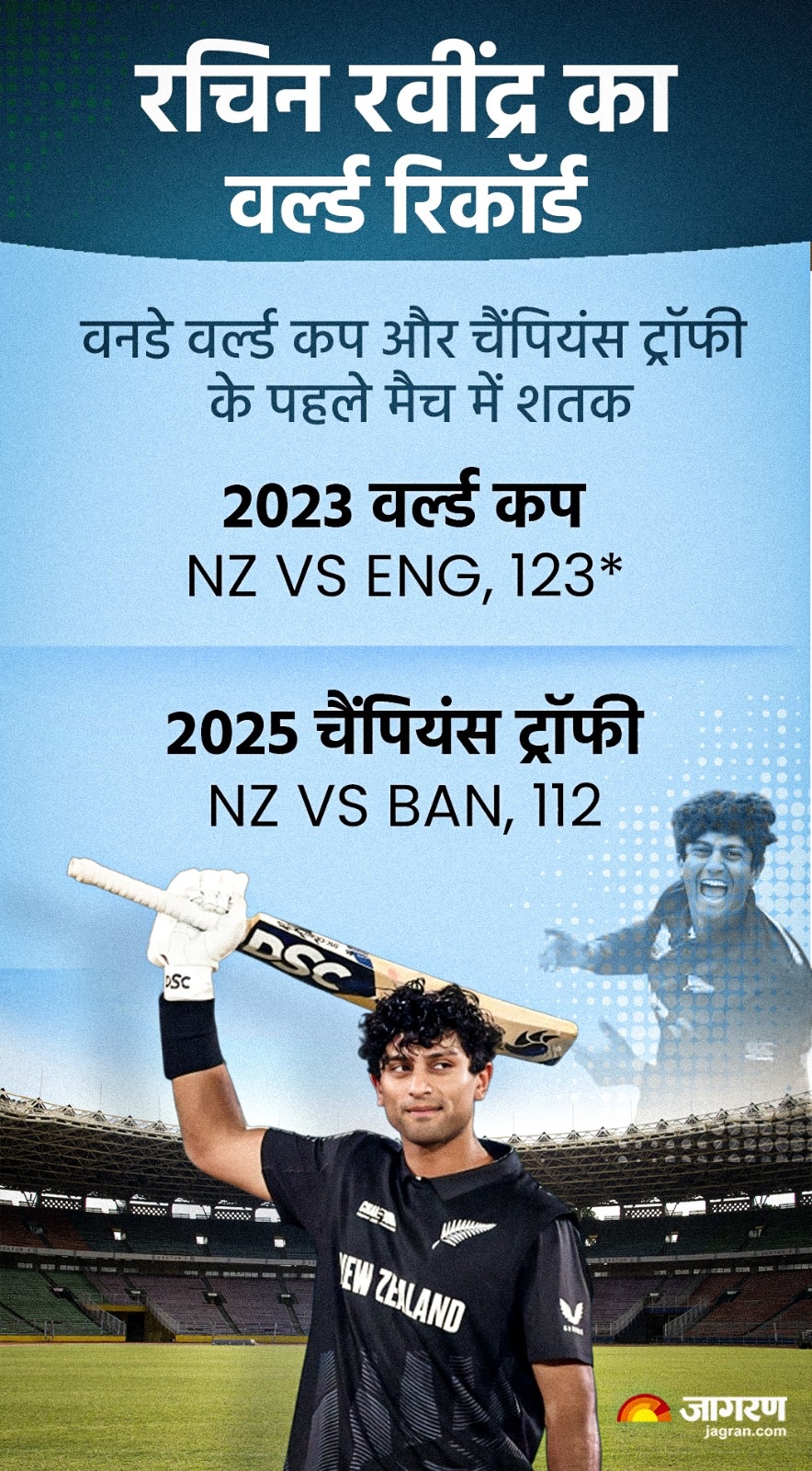 - रचिन रवींद्र वनडे वर्ल्ड कप और चैंपियंस ट्रॉफी के डेब्यू मैच में शतक जमाने वाले दुनिया के पहले बल्लेबाज बने।