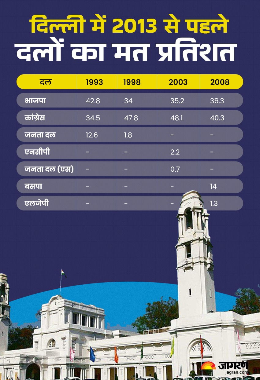 दिल्ली में 2013 से पहले दलों का मत प्रतिशत