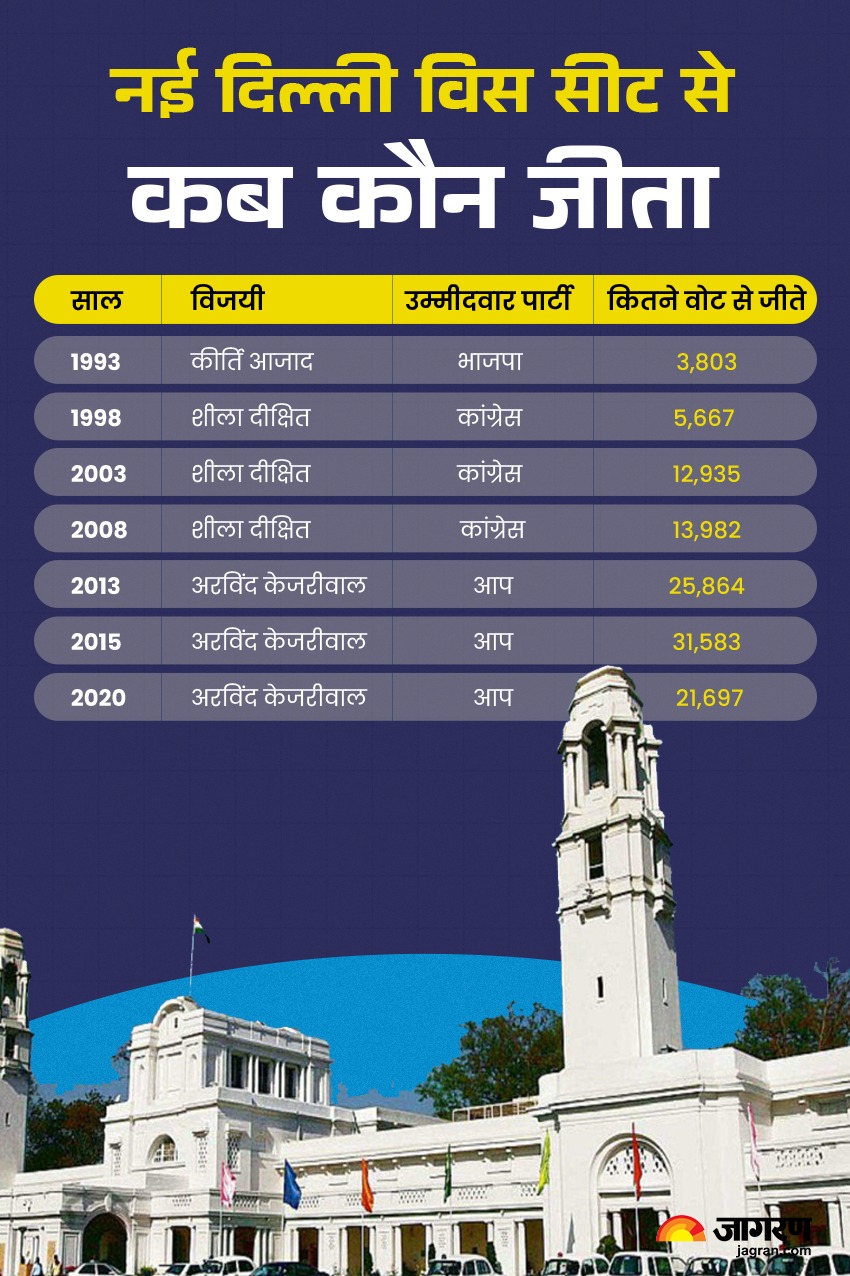 हालांकि 49 दिन ही सरकार चली, फिर वर्ष 2015 और 2020 में आप ने जीत दर्ज की। नई दिल्ली सीट से वर्ष 2013 में भाजपा ने विजेंद्र गुप्ता को यहां प्रत्याशी बनाया था जबकि 2015 में छात्र नेता रहीं नुपुर शर्मा प्रत्याशी बनी थी। वर्ष 2020 में भाजपा ने सुनील यादव को प्रत्याशी बनाया, लेकिन जीत नहीं मिली। वर्ष 2008 में यहां से भाजपा नेता विजय जौली चुनाव हार गए थे।