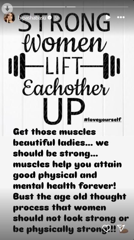 "सभी खूबसूरत महिलाएं अपनी मांसपेशियों को मजबूत बनाइए। हम सबको स्ट्रांग होना चाहिए। मसल्स आपके शरीर और आपके दिमाग को अच्छा बनाती हैं। इस पुरानी सोच को दिमाग से निकाल दीजिए कि महिलाएं मजबूत या शारीरिक रूप से मजबूत नहीं होनी चाहिए"।