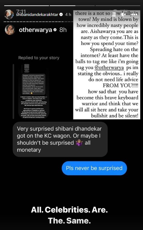 अब एक्ट्रेस ने अपने इंस्टाग्राम के स्टोरी सेक्शन में दो लोगों की बातों का स्क्रीनशॉट शेयर किया है, जो उन्हें ट्रोल कर रहे थे और खरी-खरी सुनाई है। शिबानी ने जवाब देते हुए लिखा, "ऐसा नहीं है कि ये लोग कोई नए ट्रोलर्स है, लेकिन मेरा दिमाग इस बात पर खराब हो गया कि ये कितने बुरे लोग हैं। ऐश्वर्या तुम बहुत बुरी हो। तुम इस तरह अपना समय बिताती हो? इंटरनेट पर नफरत फैलाकर? कम से कम मुझे टैग करने की हिम्मत तो रखो जैसे मैं तुम्हें यहां टैग कर रही हूं। मैं स्पष्ट कह रही हूं। मुझे तुमसे जीवन का ज्ञान नहीं चाहिए। कितने दुख की बात है तुम्हें लगता है कि तुम इतनी ताकतवर हो कि तुम कुछ भी लिख दोगी और हर कोई सिर्फ बैठकर देखता रहेगा और कुछ नहीं बोलेगा।"