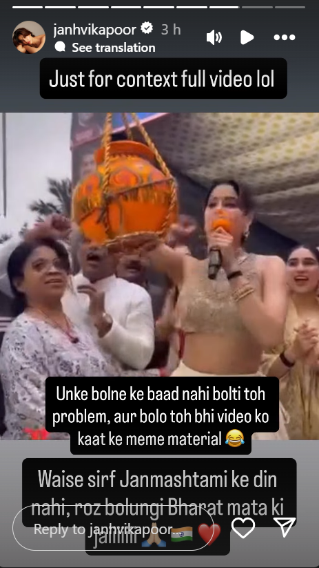 जाह्नवी ने अपनी इंस्टाग्राम स्टोरीज पर उस इवेंट का एक छोटा सा वीडियो शेयर किया, जब उन्हें हांडी फोड़ने के लिए कहा गया था। वीडियो में 'भारत माता की जय' का नारा उनके खुद बोलने से ठीक पहले सुनाई दे रहा था। उन्होंने कैप्शन में लिखा, 'सिर्फ बताने के लिए ये पूरा वीडियो अपलोड किया। वहां पहले से भारत माता की जय का नारा लगा था, उनके बोलने के बाद नहीं बोलतीं तो दिक्कत होती, और बोलो तो भी वीडियो को मीम मटीरियल के तौर पर एडिट करके अपलोड कर देते हैं'।