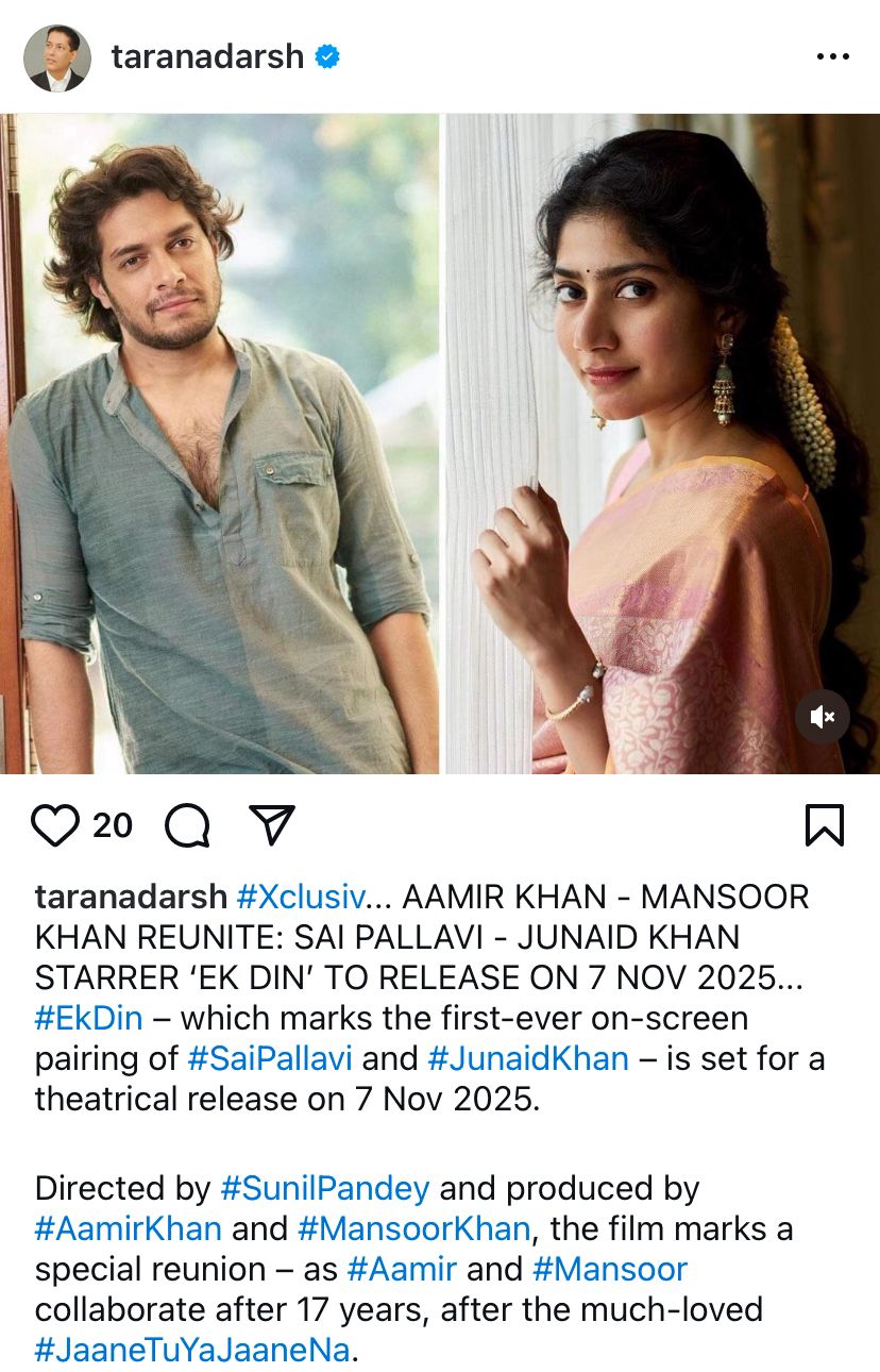 फिल्म समीक्षक तरण आदर्श ने इस बात की जानकारी अपने ऑफिशियल इंस्टाग्राम पोस्ट के जरिए दी है। तरण के अनुसार जुनैद खान फिल्म एक दिन में साउथ सिनेमा की लेडी सुपरस्टार साई पल्लवी संग रोमांस लड़ाते हुए दिखाई देंगे। इस रोमांटिक थ्रिलर के निर्माता आमिर खान हैं, जबकि डायरेक्शन की कमान सुनील पांडे के हाथ में है। मालूम हो कि मंसूर और आमिर की जोड़ी ने पहले जाने तू या जाने ना जैसी शानदार फिल्म बनाई है।
