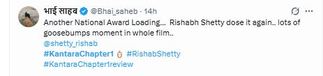दूसरे यूजर ने लिखा, "एक और नेशनल अवॉर्ड आ रहा है, क्योंकि ऋषभ शेट्टी ने एक बार फिर से बेहतरीन काम किया है। पूरी फिल्म में कई सारे ऐसे पल हैं, जिन्हें देखकर गूजबंप्स आ जाएंगे"।