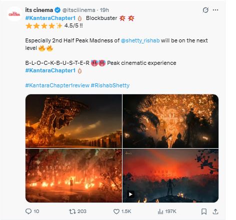 फिल्म देखकर आए एक और यूजर ने लिखा, "कांतारा चैप्टर 1 ब्लॉकबस्टर फिल्म है, खास तौर पर सेकंड हाफ में मैडनेस अपनी पीक पर है। ऋषभ शेट्टी एक अलग ही लेवल एक्टर हैं"। ये सभी के लिए एक सिनेमैटिक अनुभव है"।