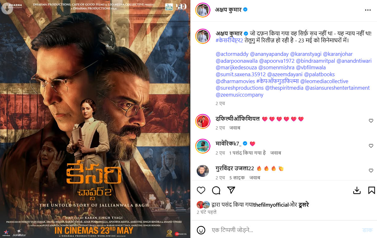 अक्षय कुमार की फिल्म केसरी चैप्टर 2 (Kesari 2 Box Office Predictions) बॉक्स ऑफिस पर रेड 2 के लिए तो मुसीबत खड़ी करेगी ही, लेकिन साउथ की दो फिल्में भी इसके निशाने पर हैं। अक्की ने अपने आधिकारिक इंस्टाग्राम पर एक पोस्ट करते हुए बताया कि ये फिल्म अब साउथ में तेलुगु (Kesari Chapter 2 Telugu Version) ऑडियंस भी देख सकेगी।