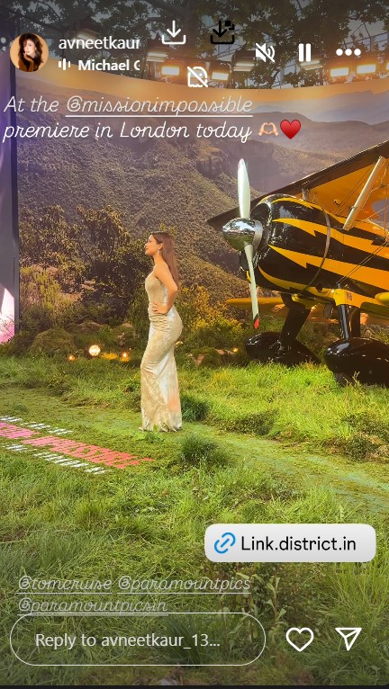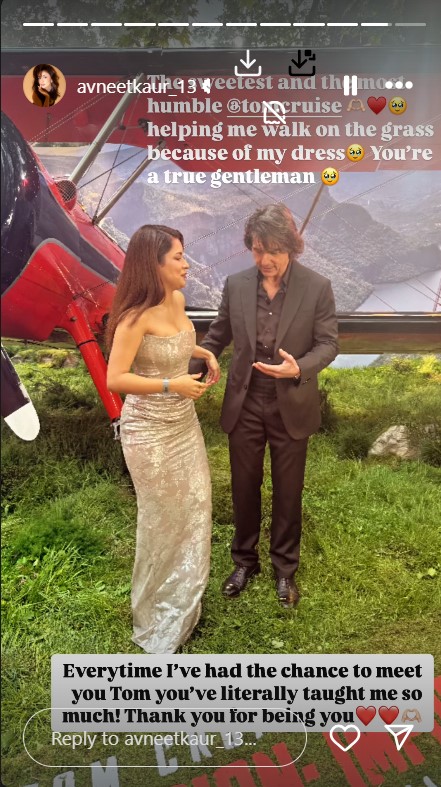 अवनीत ने प्रीमियर की कुछ तस्वीरें भी शेयर की,जिसमें उनके साथ टॉम क्रूज भी दिखाई दिए। अवनीत ने जो वीडियो शेयर किए हैं, उसमें वो एक प्रीमियर में मौजूद हैं और कैमरे के लिए पोज करती नजर आ रही हैं। उन्होंने लिखा- "आज लंदन में @missionimpossible प्रीमियर पर।"इसके अलावा उन्होंने टॉम क्रूज के साथ एक तस्वीर भी शेयर की और उन्हें "सबसे प्यारा और सबसे विनम्र" कहा। अवनीत ने बताया कि टॉम ने उन्हें घास पर चलने में मदद की क्योंकि वह अपनी ड्रेस के कारण ठीक से चल नहीं पा रही थीं। अवनीत ने उन्हें जेंटल मैन कहा। "हर बार जब मुझे आपसे मिलने का मौका मिला है टॉम, आपने सचमुच मुझे बहुत कुछ सिखाया है! आप जैसे हैं उसके लिए धन्यवाद।"