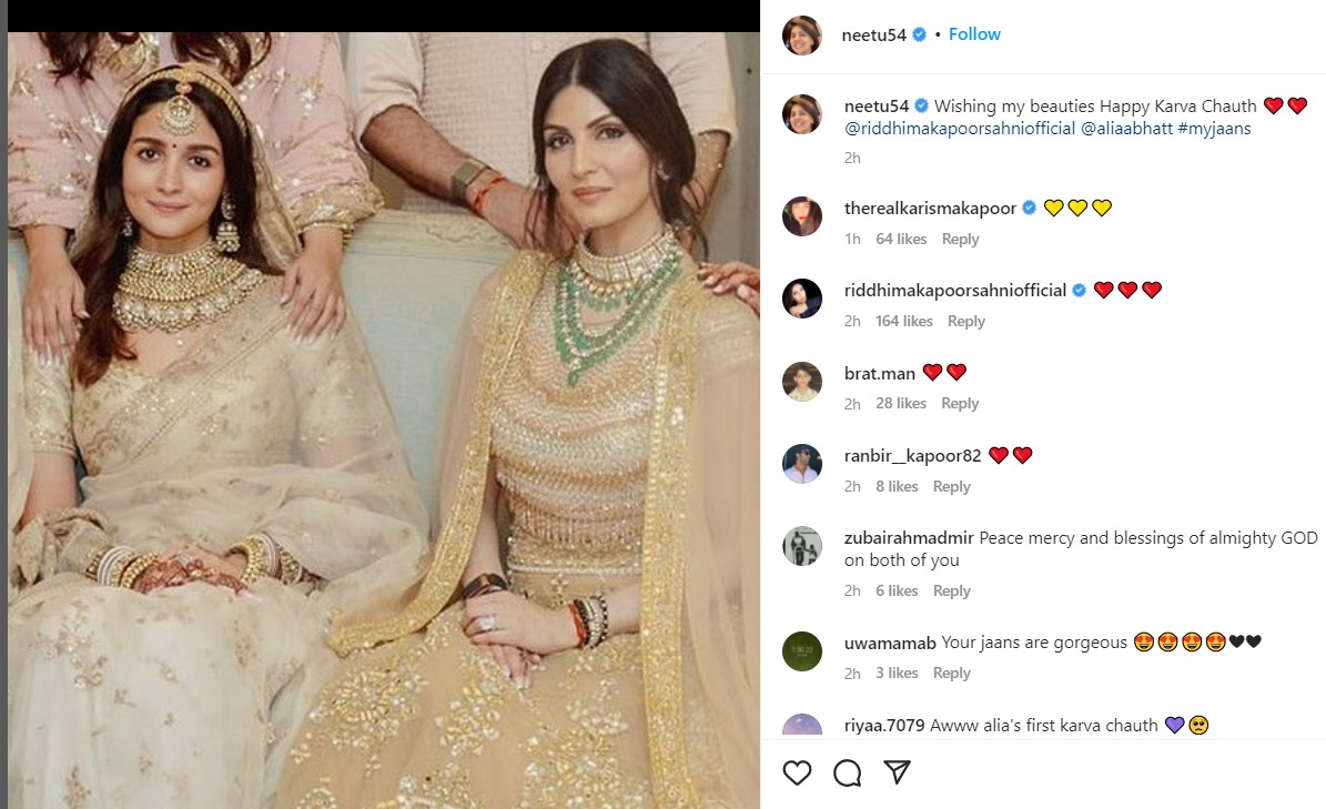 नीतू कपूर ने आलिया भट्ट की शादी की एक फोटो पोस्ट की है, जिसमें रिद्धिमा कपूर भी फ्रेम में है। इन दोनों को ही नीतू कपूर ने करवा चौथ की शुभकामनाएं दी हैं, जिस पर कमेंट करने से करिश्मा कपूर भी खुद को रोक नहीं पाईं।
