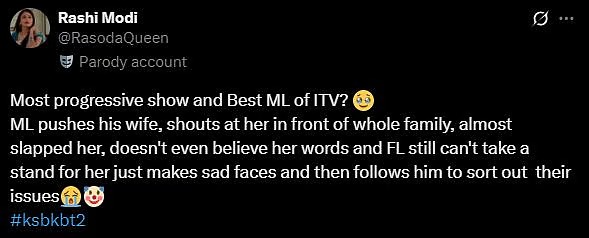 एक अन्य एक्स यूजर ने लिखा,"आईटीवी का सबसे प्रगतिशील शो और बेस्ट एमएल? एमएल अपनी पत्नी को धक्का देता है, पूरे परिवार के सामने उस पर चिल्लाता है, लगभग उसे थप्पड़ मार देता है, उसकी बातों पर विश्वास भी नहीं करता और एफएल अभी भी उसके लिए स्टैंड नहीं ले पाता, बस उदास चेहरे बनाता है और फिर अपने मुद्दों को सुलझाने के लिए उसका पीछा करता है।