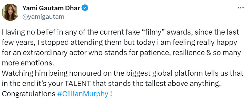 इससे पहले 'आर्टिकल 370' एक्ट्रेस यामी गौतम ने भी अपने सोशल मीडिया हैंडल एक्स पर एक पोस्ट किया। इस पोस्ट में उन्होंने लिखा, 'पिछले कुछ सालों से मौजूदा नकली 'फिल्मी' पुरस्कारों में से किसी पर भी कोई विश्वास नहीं होने के कारण, मैंने उनमें भाग लेना बंद कर दिया है, लेकिन आज मैं एक असाधारण अभिनेता के लिए वास्तव में खुश महसूस कर रही हूं, जो धैर्य, लचीलापन और बहुत सारी भावनाओं का प्रतीक है। सबसे बड़े वैश्विक मंच पर उन्हें सम्मानित होते देखना हमें बताता है कि अंत में यह आपकी प्रतिभा ही है, जो किसी भी चीज से कई ऊपर है। बधाई हो Cillian Murphy'।