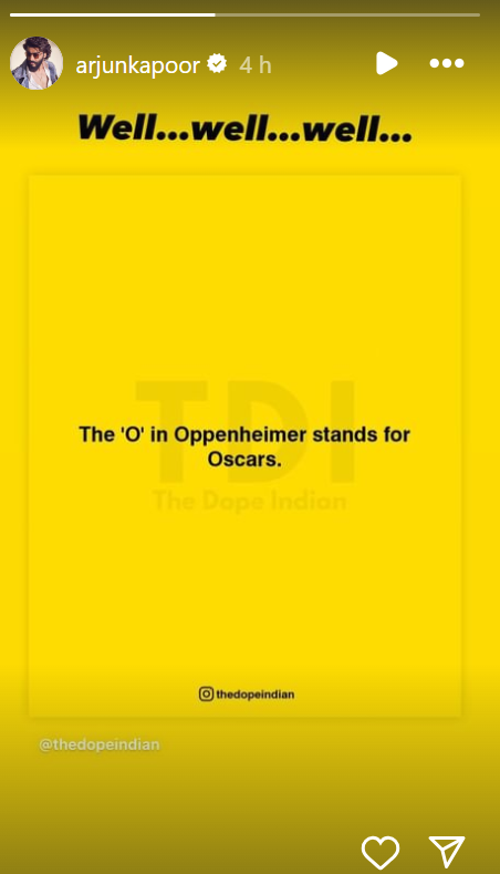 अर्जुन कपूर ने आज 11 मार्च को अपने सोशल मीडिया हैंडल इंस्टाग्राम पर एक स्टोरी शेयर की है। इस पोस्ट में लिखा था कि द ओ इन ओपेनहाइमर का मतलब ऑस्कर है। इसके साथ ही एक्टर ने कैप्शन में लिखा, 'वेल... वेल... वेल'।