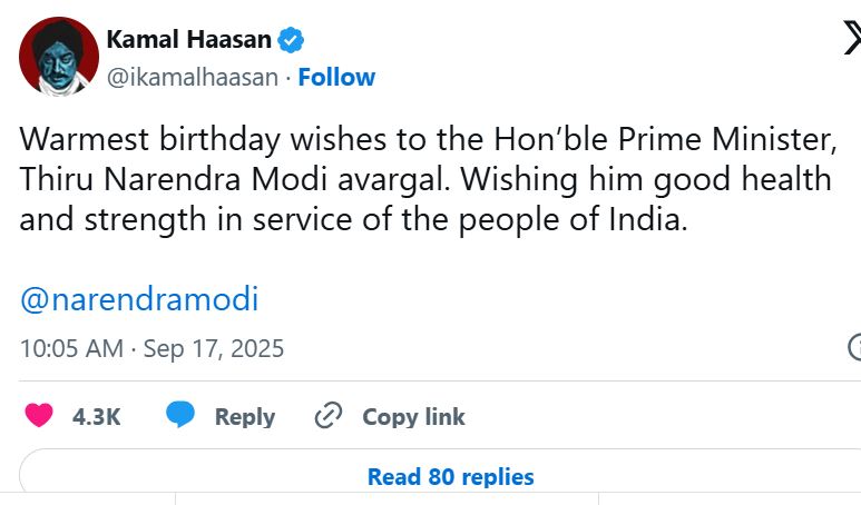कमल हासन ने लिखा, "माननीय प्रधानमंत्री श्री तिरु नरेंद्र मोदी जी को जन्मदिन की हार्दिक शुभकामनाएं। मैं उनके उत्तम स्वास्थ्य और भारत के लोगों की सेवा में शक्ति प्रदान करने की कामना करता हूं"। इन सितारों के अलावा आलिया भट्ट, एस एस राजामौली, आर माधवन, शाह रुख खान पवन कल्याण जैसे सितारों ने भी प्रधानमंत्री नरेंद्र मोदी को जन्मदिन की शुभकामनाएं दी।