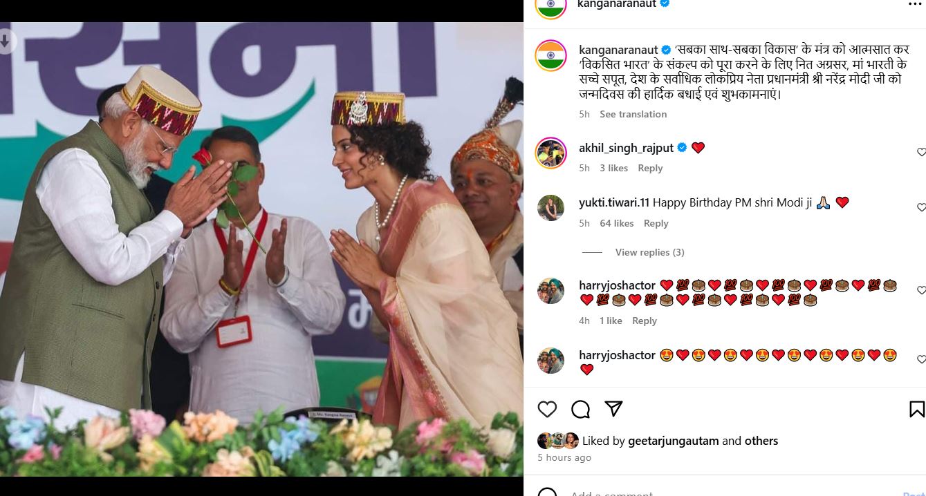 कंगना रनौत ने लिखा, "सबका साथ-सबका विकास’ के मंत्र को आत्मसात कर ‘विकसित भारत’ के संकल्प को पूरा करने के लिए नित अग्रसर, मां भारती के सच्चे सपूत, देश के सर्वाधिक लोकप्रिय नेता प्रधानमंत्री श्री नरेंद्र मोदी जी को जन्मदिवस की हार्दिक बधाई एवं शुभकामनाएं"।