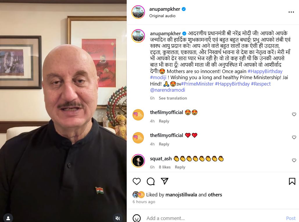 अनुपम खेर ने लिखा, "आदरणीय प्रधानमंत्री श्री नरेंद्र मोदी जी! आपको आपके जन्मदिन की हार्दिक शुभकामनाएं एवं बहुत बहुत बधाई! प्रभु आपको लंबी एवं स्वस्थ आयु प्रदान करे! आप आने वाले बहुत सालों तक ऐसी ही उदारता, दृढ़ता, कुशलता, एकाग्रता, और निस्वार्थ भावना से देश का नेतृत्व करें। मेरी मां भी आपको ढेर सारा प्यार भेज रही है! वो तो कह रही थी कि उनकी आपसे बात भी करा दूं! आपकी माता जी की अनुपस्थित में आपको वो आशीर्वाद देगी"।