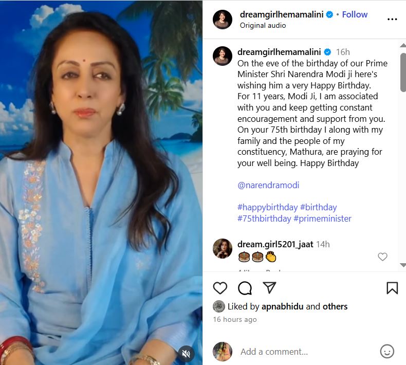 हेमा मालिनी ने पीएम मोदी को जन्मदिन की बधाई देते हुए एक वीडियो शेयर किया, जिसमें उन्होंने कहा कि वह अपनी और सभी बृजवासियों की तरफ से उन्हें ढेरों शुभकमनाएं देती हैं। उन्होंने प्रधानमंत्री को बधाई देते हुए कैप्शन में लिखा, "हमारे प्राइम मिनिस्टर नरेंद्र मोदी जी के बर्थडे के खास मौके पर मैं उन्हें ढेरों शुभकामनाएं देती हूं। 11 सालों से मैं आपसे जुड़ी हुई हूं और मुझे लगातार आपसे हिम्मत और सपोर्ट मिल रहा है। आपके 75वें जन्मदिन के मौके पर मैं मेरा परिवार और मथुरा के सभी लोग आपके अच्छे स्वास्थ्य की कामना करते हैं"।