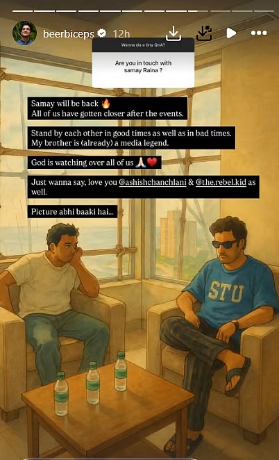 अब हाल ही में रणवीर इलाहबादिया ने अपने इंस्टाग्राम हैंडल पर ‘Ask Me Anything’ सेशन आयोजित किया था जिसमें उन्होंने इंडियाज गॉट लेटेंट विवाद के बारे में कई सवालों के जवाब दिए। जब एक यूजर ने पूछा कि क्या वह अभी भी समय रैना के संपर्क में है, तो रणवीर ने खुलासा किया कि घटना के बाद वे और भी करीबी दोस्त बन गए हैं। उन्होंने आशीष चंचलानी और अपूर्व मुखीजा उर्फ द रिबेल किड को भी अपना समर्थन दिया।