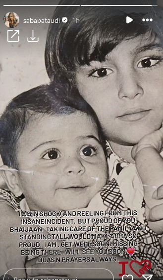 सबा ने इंस्टाग्राम स्टोरीज में लिखा,"मैं हैरान हूं। इससे उबरने की कोशिश कर रही हूं,लेकिन भाईजान आप पर गर्व है। परिवार का ख्याल रखना और मुश्किल वक्त में खड़ा होना, अब्बा को गर्व महसूस कराएगा। जल्द ठीक हो जाइए। वहां होने का मन कर रहा है, जल्दी मिलते हैं। हमेशा दुआएं और प्रार्थनाएं।" सबा ने इस पोस्ट में सैफ के साथ अपनी बचपन की एक तस्वीर भी साझा की।