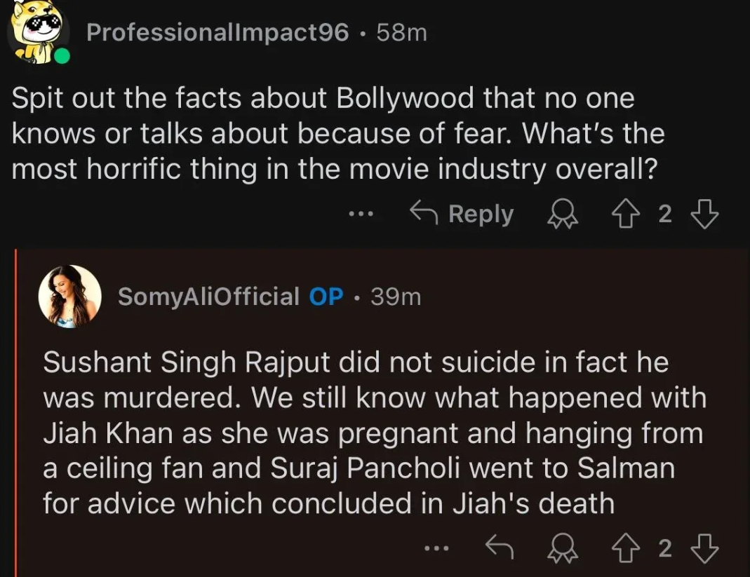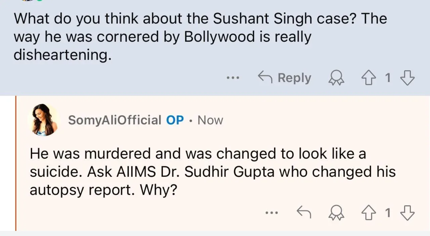 इस बीच सोमी ने रेडिट पर एक आस्क मी सेशन (AMA session) रखा था। जहां उन्होंने बिश्नोई समुदाय के साथ खान के विवाद के साथ-साथ 90 के दशक में अपने और सलमान खान के रिश्ते पर भी बात की। वहीं सुशांत सिंह राजपूत वाले मामले में बोलते हुए सोमी ने तहलका ही मचा दिया। सोमी ने कहा कि सुशांत सिंह राजपूत का मर्डर हुआ था और उनकी ऑटोप्सी रिपोर्ट में दिखाया गया कि उन्होंने सुसाइड किया है।