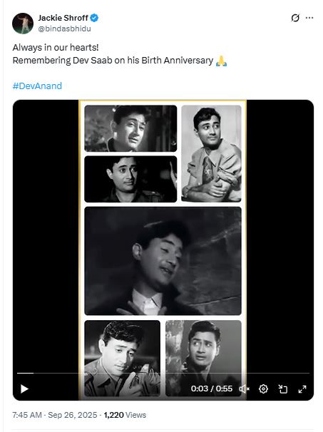 शत्रुघ्न सिन्हा के अलावा देवानंद की फिल्म 'स्वामी देव' में छोटा सा रोल करने वाले जैकी श्रॉफ ने भी एक बेहतरीन वीडियो शेयर करते हुए लिखा, "आप हमारे दिलों में हमेशा जिंदा रहेंगे, देव साहब की बर्थ एनिवर्सरी पर उन्हें याद कर रहा हूं"।
