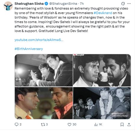 इन सभी खूबसूरत अनदेखी फोटोज को शेयर करते हुए शत्रुघ्न सिन्हा ने अपने एक्स अकाउंट के कैप्शन में लिखा, "सबसे स्टाइलिश और सबसे यंग फिल्ममेकर देवानंद साहब को कुछ प्यार और स्नेह से भरी इन प्यारी वीडियो के साथ उनके जन्मदिन पर याद कर रहा हूं। ज्ञान के सागर रहे देवानंद ने हमेशा तब और भविष्य में होने वाले बदलाव को लेकर हमेशा बात की, जो प्रेरणादायक थीं। देव साहब मैं आपके स्नेह, गाइडेंस, साहस और मुझे सही दिशा दिखाने और हमेशा सपोर्ट करने के आपका आभारी रहूंगा। देव साहब हमेशा अमर रहें"।