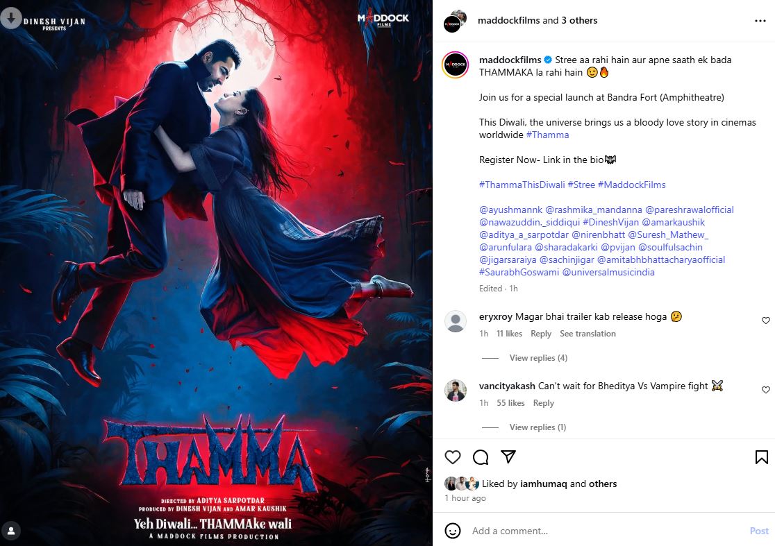 पोस्ट देखकर फैंस इस बात को लेकर कन्फ्यूज हैं कि मेकर्स 'स्त्री -3' को लेकर सरप्राइज देंगे, या फिर थामा का ट्रेलर लॉन्च करेंगे। एक यूजर ने लिखा, "अरे भाई परसों क्या होने वाला है कोई तो बता दो"। दूसरे यूजर ने लिखा, "मैं भेड़िया और वैम्पायर की लड़ाई के लिए और इंतजार नहीं कर सकती"।