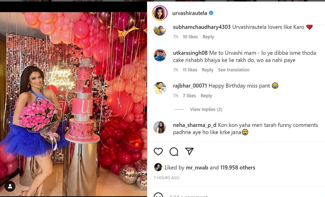 वहीं, कई लोगों ने इसे लेकर उन्हें ट्रोल किया है। एक ने लिखा है, 'कितना पिंक कलर पसंद है लड़कियों को।' एक ने लिखा है, 'हैप्पी बर्थडे।' एक ने लिखा है, 'लो यह डिब्बा, इसमें थोड़ा केक ऋषभ भैया के लिए रख दो। वह आ नहीं पाए।' एक ने लिखा है, 'हैप्पी बर्थडे मिसेस पंत।' एक ने लिखा है, 'उर्वशी आपकी स्वीटनेस हर दिन बढ़ते ही जा रही है।'