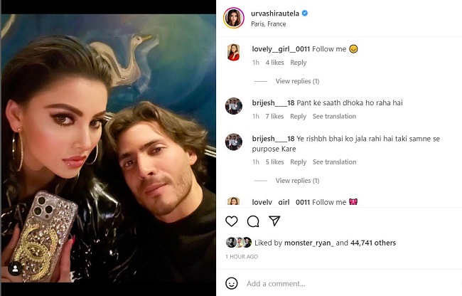उर्वशी रौतेला की तस्वीर पर 1 घंटे में हजारों की संख्या में लाइक्स और कमेंट्स किए गए हैं। एक फैन ने लिखा है, 'पंत के साथ धोखा हो रहा है। एक ने लिखा है, 'यह ऋषभ भाई को जला रही है ताकि सामने से प्रपोज करें।' एक ने लिखा है, 'ऋषभ पंत डिस्चार्ज होने वाला है हॉस्पिटल से, टाइम से वापस आ जाना।' एक ने लिखा है, 'अब यह कौन है, ऋषभ पंत को धोखा था।'
