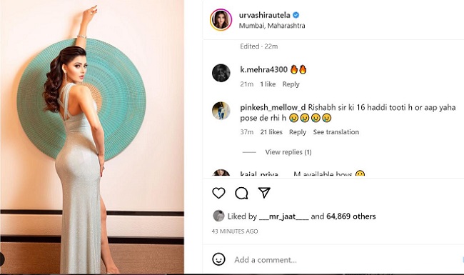 उर्वशी रौतेला ने फोटोज में कई लोगों को टैग भी किया है। एक ट्रोल ने लिखा है, 'ऋषभ पंत की 16 हड्डी टूटी है और आप यहां पोज दे रही हो।' एक ने लिखा है, 'आशिक बनाया आपने।' एक ने लिखा है, 'उर्वशी रौतेला मोस्ट ब्यूटीफुल वूमेन।' एक ने लिखा है, 'वेरी हॉट एक्ट्रेस इन बॉलीवुड इंडस्ट्री।'