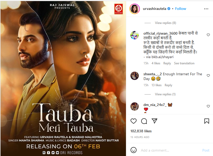 उर्वशी रौतेला ने अपने आधिकारिक इंस्टाग्राम अकाउंट पर एक पोस्ट शेयर किया है। इस पोस्ट के ज्यादा इसका कैप्शन चर्चा में बना हुआ है। उर्वशी ने अपने आने वाले गाने का पोस्टर शेयर किया है। उर्वशी जल्द ही 'तौबा मेरी तौबा' गाने में नजर आने वाली हैं। उन्होंने अपने इसी गाने का पोस्ट कर शेयर कर कैप्शन में लिखा, 'किस्मत बुरी थी मेरी, ना वो शख्स बुरा था...जिस वक्त दिल लगा, वो वक्त बुरा था।'