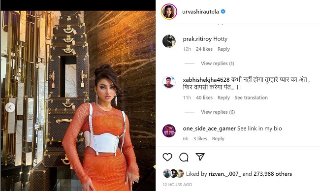 उर्वशी रौतेला ने तस्वीरें 12 घंटे पहले शेयर की है, जिसे पौने तीन लाख के करीब लाइक्स मिले हैं। वहीं, तस्वीरों पर 2 हजार से ज्यादा कमेंट किए गए हैं। कई लोगों ने में तस्वीरों पर उनकी सराहना की है। वहीं, कई लोगों ने उन्हें ऋषभ पंत के नाम से टीज किया है। एक फैन ने लिखा है, 'ऋषभ पंत।' वहीं एक ने लिखा है, 'कभी नहीं होगा तुम्हारे प्यार का अंत, फिर वापसी करेगा पंत।' एक ने लिखा है, 'ऋषभ पंत देख रहे हो ना भैया। भाभी की कैसी लग रही है।' वहीं एक ने उनसे प्रश्न पूछा है, 'और मेरे आरपी भाई कैसे हैं, कोई अपडेट?'