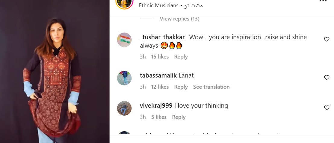 एक्ट्रेस की इस वीडियो पर उर्वशी रौतेला कमेंट किया है उन्होंने लिखा है- हमें आप पर गर्व है क्वीन। हम अपनी महिलाओं का समर्थन करते हैं। वहीं टीवी एक्ट्रेस स्मृति खन्ना ने कमेंट में सलाम करने वाला इमोजी बनाया है। वहीं अन्य यूजर की बात करे तो एक ने लिखा है- वाह...आप प्रेरणा हैं...उठे और हमेशा चमकें। वहीं दूसरे ने लिखा है- मुझे आपकी सोच से प्यार है। एक के बाद एक कई लोग एक्ट्रेस के समर्थन में आ रहे हैं।