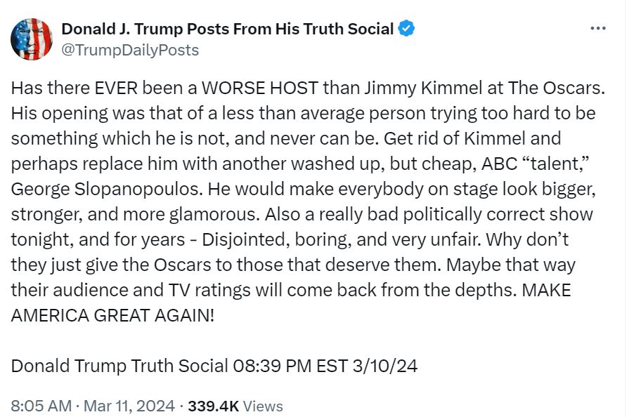 डोनाल्ड ट्रम्प ने जिमी किमेल को लेकर ट्रुथ सोशल पर एक लम्बा-चौड़ा पोस्ट किया था। उन्होंने जिमी को सबसे बेकार होस्ट बताया था। डोनाल्ड ने आगे लिखा था, "आज रात का राजनीतिक रूप से सही शो भी बहुत खराब है, और वर्षों तक - असंबद्ध, उबाऊ और बहुत अनुचित। वे सिर्फ उन लोगों को ऑस्कर क्यों नहीं देते जो उनके लायक हैं। शायद इस तरह से उनके दर्शक और टीवी रेटिंग गहराई से वापस आ जाएंगी। अमेरिका को फिर से महान बनाएं।"