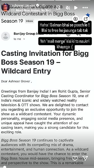 बिजनेसमैन अशनीर ग्रोवर ने अपनी इंस्टा स्टोरी में एक स्क्रीनशॉट शेयर किया है जिसमें ऐसा दिखाई दे रहा है कि उन्हें बिग बॉस से ऑफिशियल मेल आया है कि वो शो को वाइल्ड कार्ड कंटेस्टेंट के तौर पर ज्वाइन करें। अभी इस बात की पुष्टि नहीं हुई है कि इस खबर में कितनी सच्चाई है लेकिन मेल के हिसाब से उन्हें ये बिग बॉस 19 के सीनियर कास्टिंग कॉर्डिनेटर ने भेजा है।