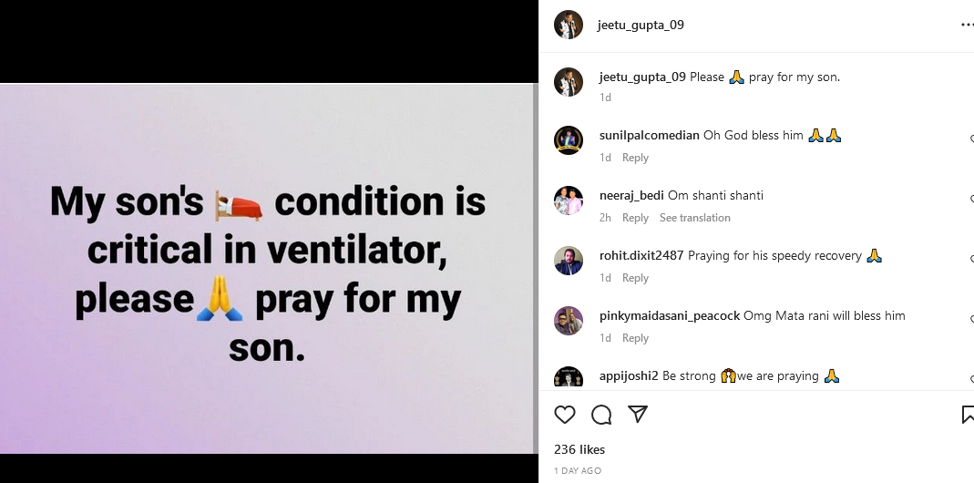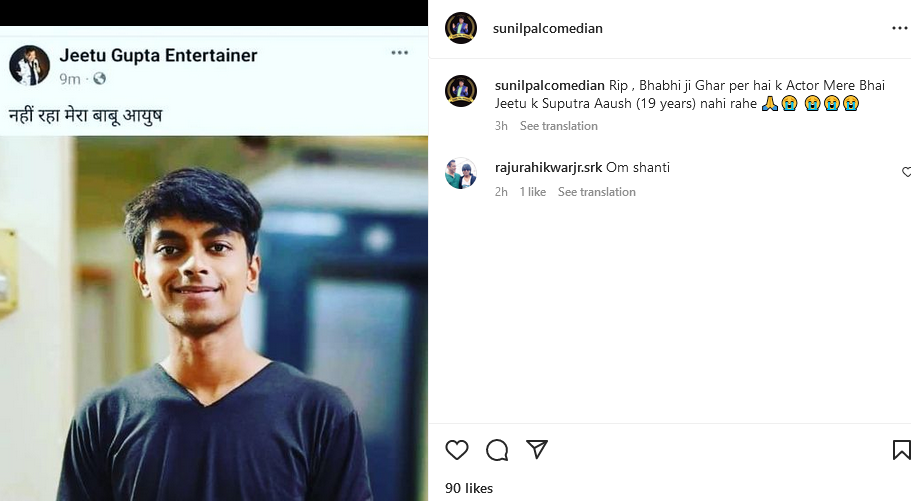 आपको बता दें कि कॉमेडियन सुनील पाल ने इंस्टाग्राम पर जीतू गुप्ता के एक पोस्ट को री-शेयर करते हुए उनके (19 साल) के बेटे आयुष के निधन की खबर दी है। उन्होंने भावुक कर देने वाले शब्द लिखे। उन्होंने दीपू की तस्वीर को पोस्ट करते हुए लिखा, ‘ RIP, भाभी जी घर पर हैं के एक्टर, मेरे भाई जीतू के सुपुत्र आयुष 19 साल नहीं रहे।‘ सुनील पाल ने अपने कैप्शन में बहुत सारी रोने वाली इमोजी भी शेयर किए हैं। सुनील को अपने दोस्त के बेटे के निधन से गहरा झटका लगा है।