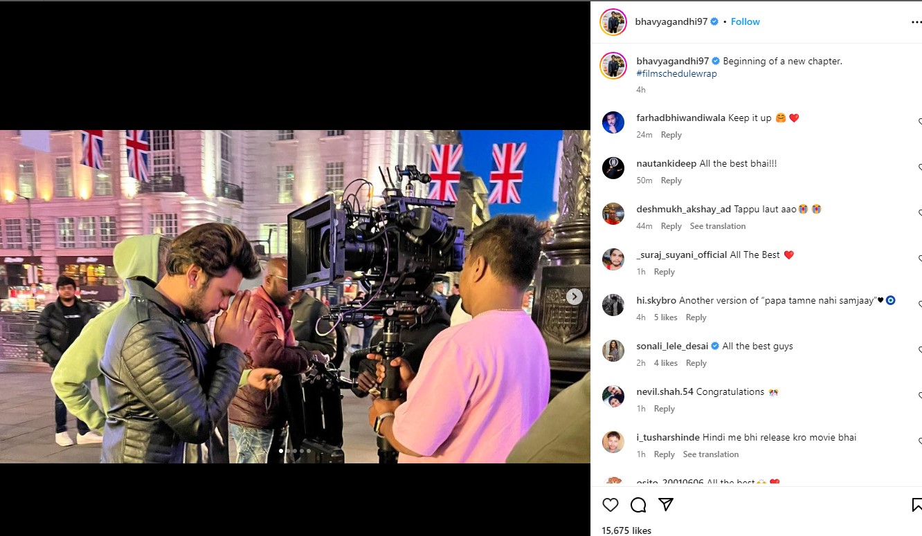 भव्य गांधी ने लंदन से अपनी 'न्यू बिगनिंग्स' की झलक फैंस के साथ शेयर की है। इस अनटाइटल्ड फिल्म के सेट से उन्होंने कास्ट और क्रू मेंबर्स के साथ कई तस्वीरें शेयर कीं, जिसे देखने के बाद फैंस की एक्साइटमेंट बढ़ गई है। बता दें कि भव्य गांधी की फिल्म में हार्दिक संगानी, हेमंग देव, टीकू तलसानिया, नवीन बावा और व्रिती वघानी भी एक्टिंग करते नजर आएंगे।