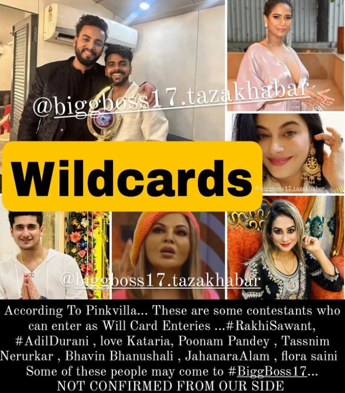 अब बिग बॉस के एक इंस्टाग्राम पेज पर जानकारी शेयर करते हुए बताया है कि शो में ट्विस्ट लाने हुए मेकर्स एक साथ 8 कंटेस्टेंट को वाइल्ड कार्ड के तौर पर एंट्री देंगे। वाइल्ड कार्ड के तौर पर जो कंटेस्टेंट शो में नजर आ सकते हैं, उसमें सोशल मीडिया इन्फ्लूएंसर भाविन भानुशाली, लव कटारिया, तसनीम नेरुरकर, बांग्लादेशी क्रिकेटर जहानारा आलम, फ्लोरा सैनी शामिल हैं।