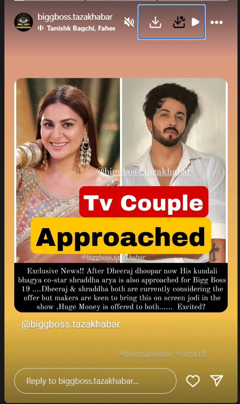 विवादित रियलिटी शो बिग बॉस 19 (Bigg Boss 19) का न्योता टीवी की पॉपुलर एक्ट्रेस श्रद्धा आर्या को भेजा गया है। बिग बॉस ताजा खबर के इंस्टाग्राम पर इससे जुड़ा नया अपडेट शेयर किया गया है कि पहले उनके कुंडली भाग्य के ऑनस्क्रीन पार्टनर धीरज धूपर को शो का ऑफर दिया गया और इसके बाद अब श्रद्धा को न्योता भेजा गया है।
